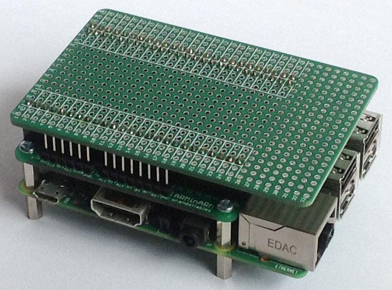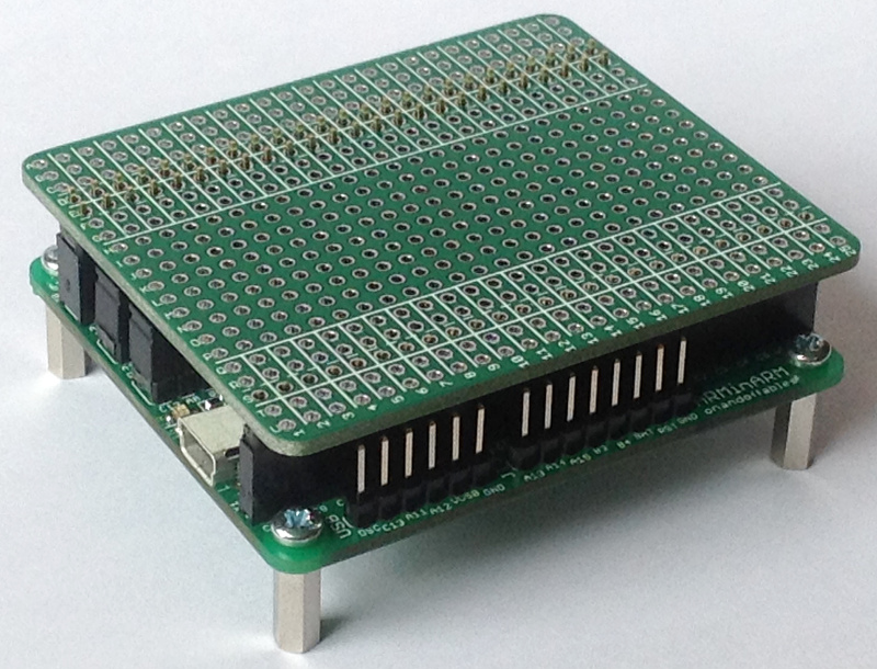 Please note that all pins align on a 0.1" grid. Any piece of protoboard with male pins will fit on the ARMinARM board. The protocaps just fit nicely.