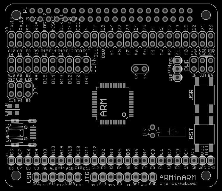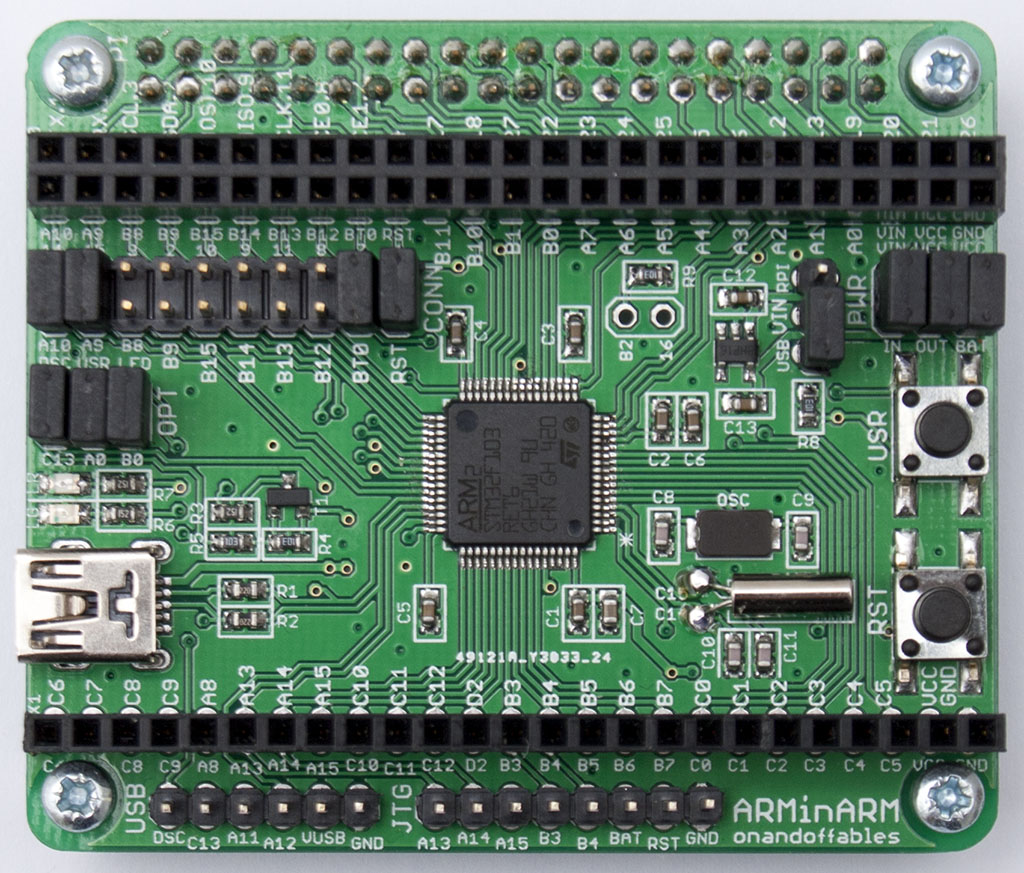 OPT HeaderThe OPT header contains the pins that define the ARMinARM board. Jumper PC13 to the USB Disconnect circuitry. You'll need it if you want to program the STM32 as a USB device. Jumper the USR button to PA0. The USR button is also connected to the BOOT0 pin, and is therefore pulled down to GND. To use PA0 as an analog input (and read values other than 0) you'll want to disconnect it from the USR button. Note that when you disconnect PA0 from the USR button, it is still possible to use the buttons USR and RST to put the STM32 into bootloader mode. Jumper the LED pin to PB0 to use the onboard LED. PB0 is a PWM capable pin. If you want to use PB0 for anything else and the LED annoys you, disconnect it. ![]() | |||||