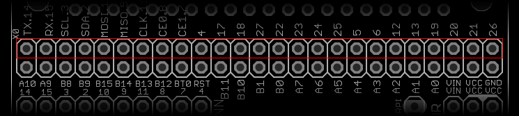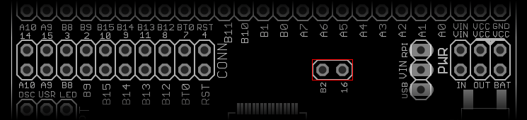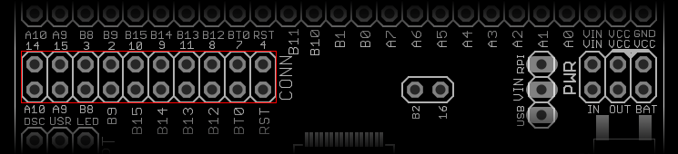 PWR HeaderMore options to decide how you want to power the board. You'll probably want all 3 jumpers on here (IN/VIN, OUT/VCC, BAT/VCC). If you're not using a battery, connecting VBAT to VCC is highly recommended. It keeps the RTC running and remembers the content of backup registers. You can bypass the onboard 3.3V voltage regulator completely by leaving off the IN/VIN and OUT/VCC jumpers (in that case, power VCC with your own 3.3V). Never connect more than 5 volt to the input of the voltage regulator! ![]() | |||||