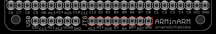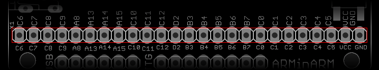 USB HeaderThe USB header contains 'everything USB'. Mainly to break out pins PA11 and PA12, the D+ and D- (USB data) pins of the STM32. They're here if you need them for anything else (and having PC13, VUSB and a GND there is of course handy as well). In emergencies, another STM32 GPIO than PC13 can be routed to the DSC (USB Disconnect circuitry) pin here if you want to make the ARMinARM board hardware compatible with other boards (without recompiling their firmware). Or other unforeseen situations you might encounter. It's here if you're looking for it. ![]() | |||||